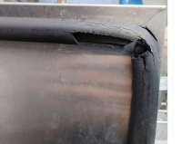 現場調査で状態をチェックすると、扉パッキンが激しく割れ硬化しており、閉まりにくい状