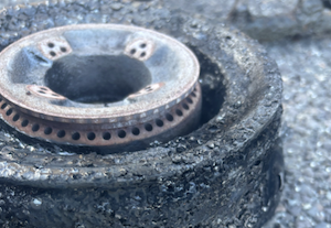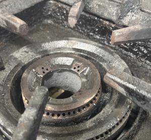 調査の結果、ガスバーナーの詰まりと五徳の焦げ付きが原因でした。