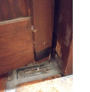 開け閉めによる劣化と扉のヒンジ棒破損を確認。
